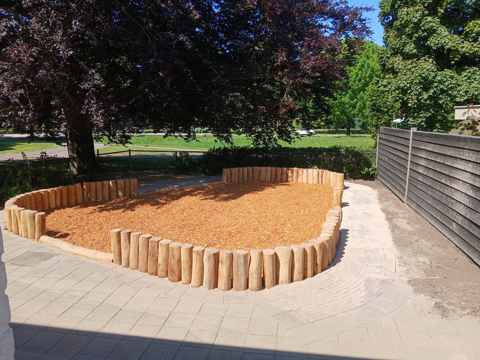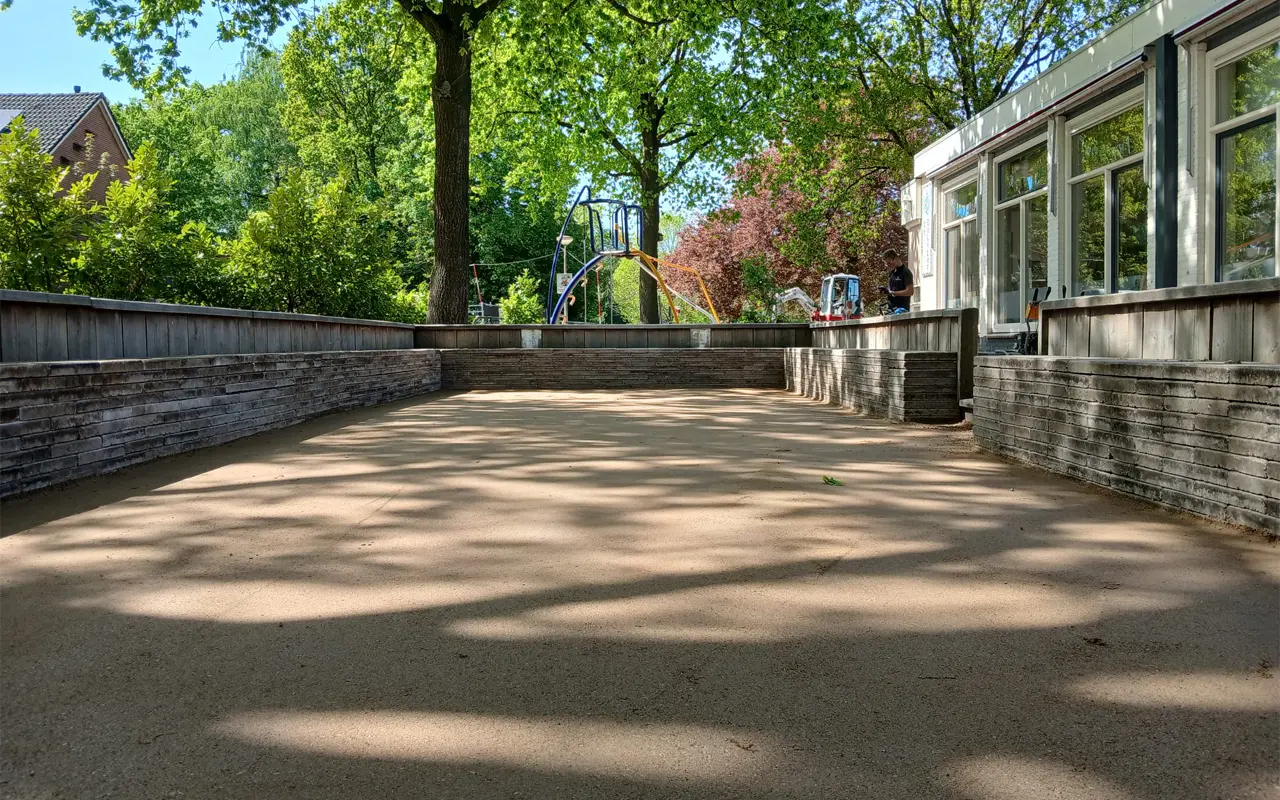 Op het schoolplein zijn houtsnippers aangebracht om een natuurlijke en duurzame speelomgeving te creëren. De houtsnippers zorgen voor een zachte en veilige ondergrond waar kinderen goed op kunnen spelen. Dit materiaal sluit goed aan bij de groene stijl van het plein en zorgt ervoor dat de bodem gezond en stevig blijft. Dankzij de houtsnippers kan het regenwater ook beter wegzakken in de grond, wat weer goed is voor het groen op het plein!