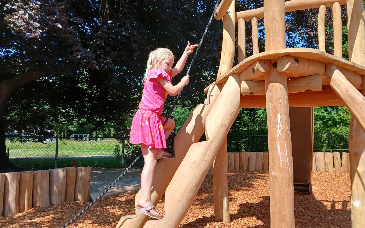 Rondom enkele speellocaties zijn robinia palen geplaatst. Deze stevige en duurzame houten palen geven het plein een warme en natuurlijke uitstraling. Omdat robinia hout van nature weerbestendig en splintervrij is, past het perfect bij een speelomgeving waar kinderen veilig en zorgeloos kunnen spelen en ontdekken.